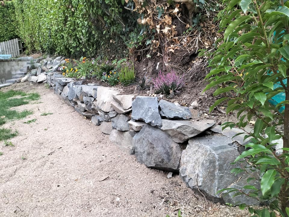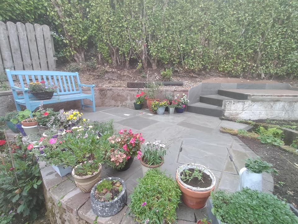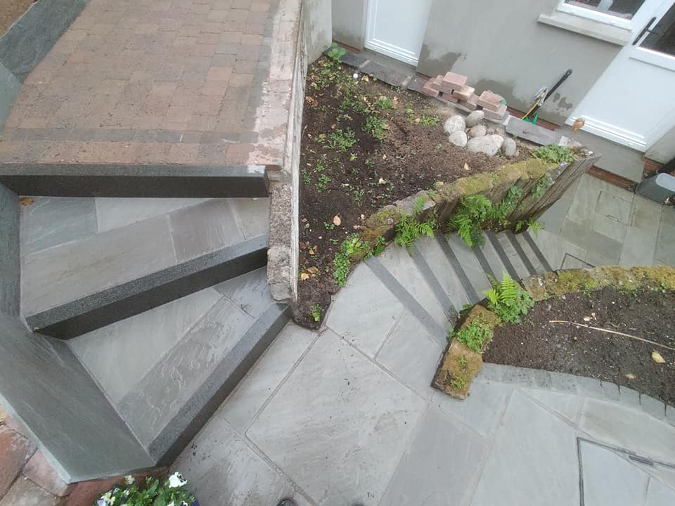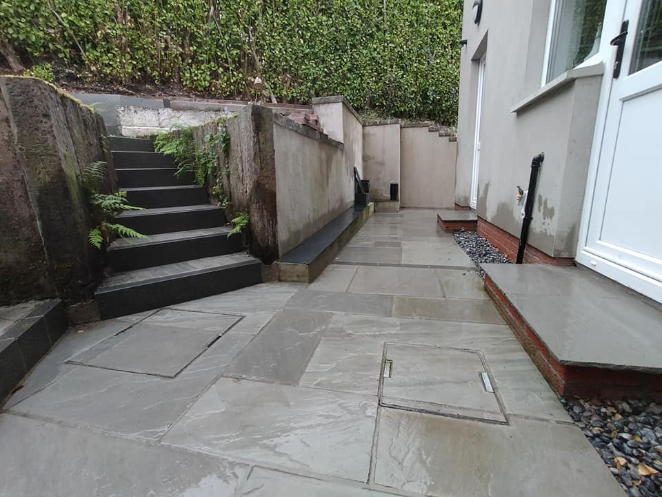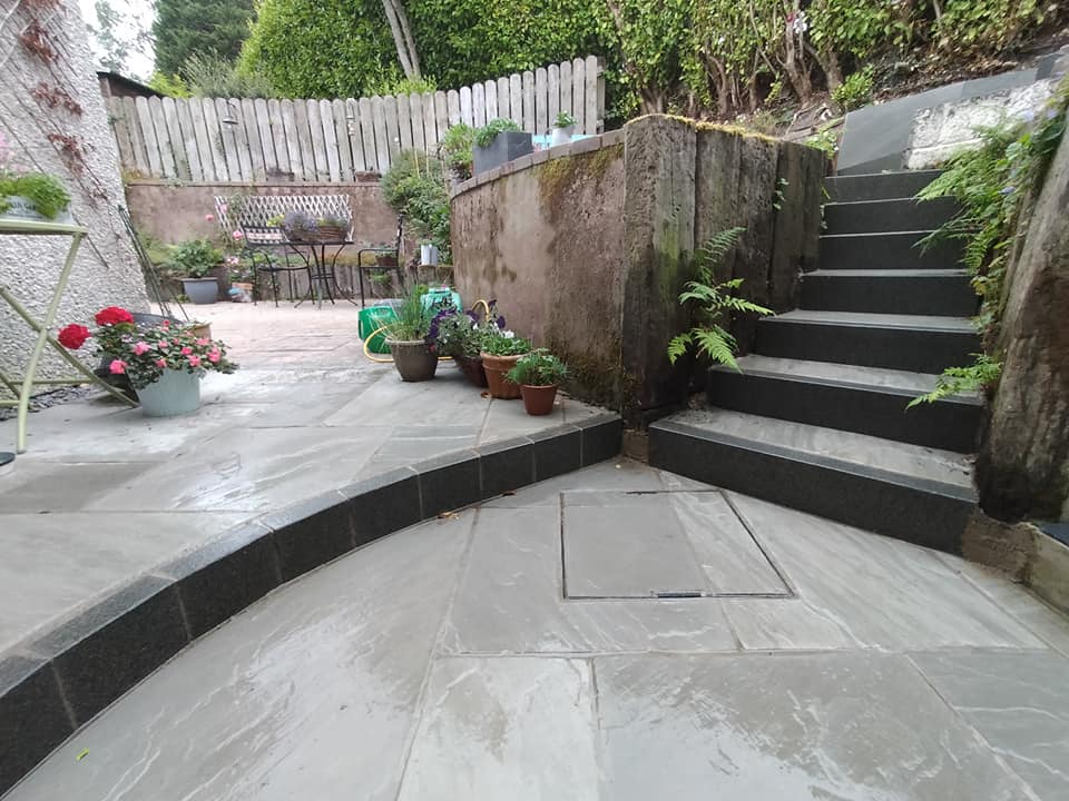 The finished garden is a perfect blend of usability and rustic elegance, making the most of the available space while preserving the natural, mature feel of the surroundings. The combination of granite steps, sandstone paving, stone cladding, and lush planting creates a timeless outdoor retreat, ideal for relaxation and entertaining.