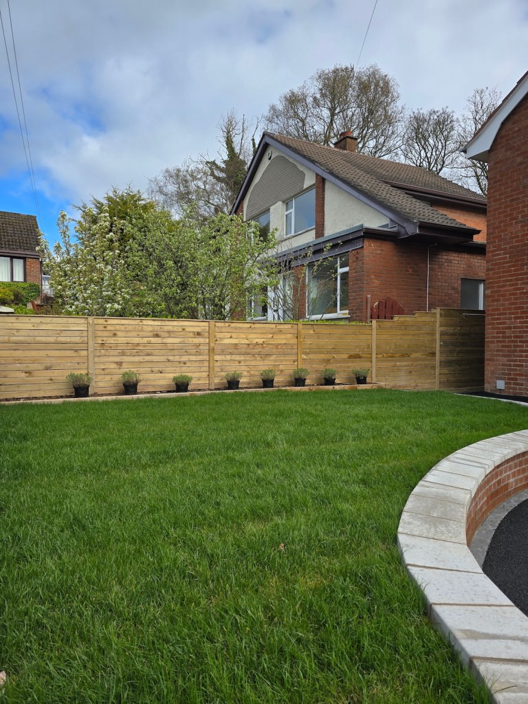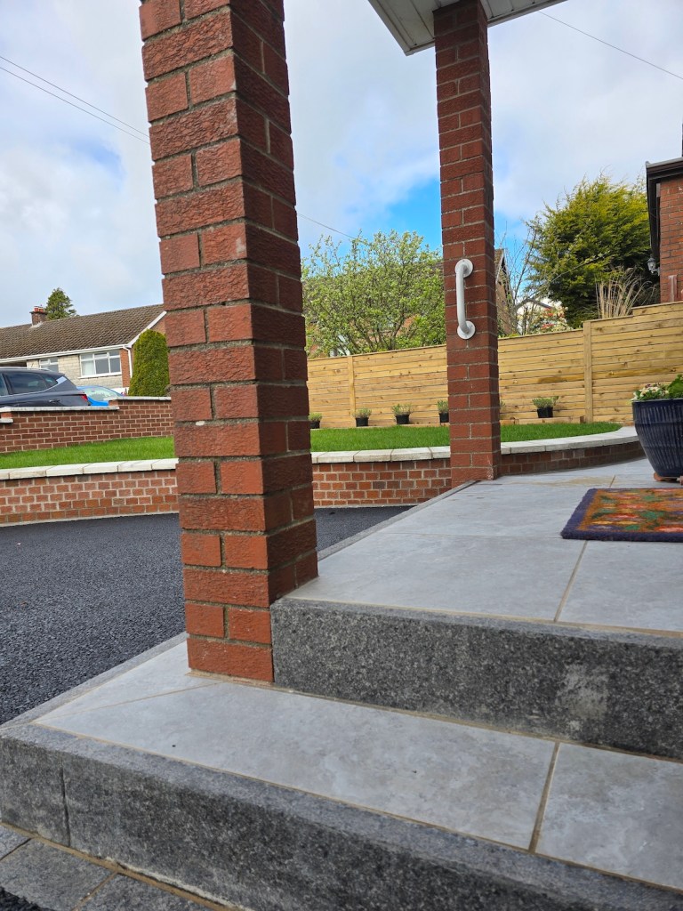The works covered a full redesign and rebuild of both the rear garden and the front approach, including new levels, steps, retaining details, paving, turfing, boundary fencing, garden walls and a brand-new tarmac driveway. Every element was carefully considered to enhance usability, improve access, and tie the front and rear spaces together with a consistent, contemporary finish.