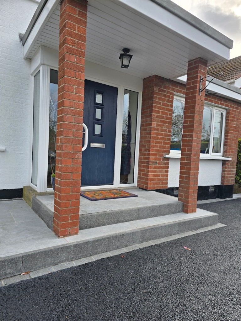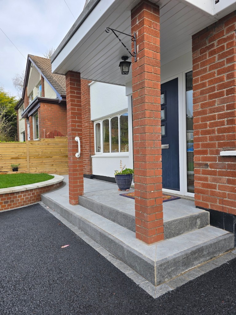 - Installed new steps and paving in light grey porcelain, edged with black basalt setts